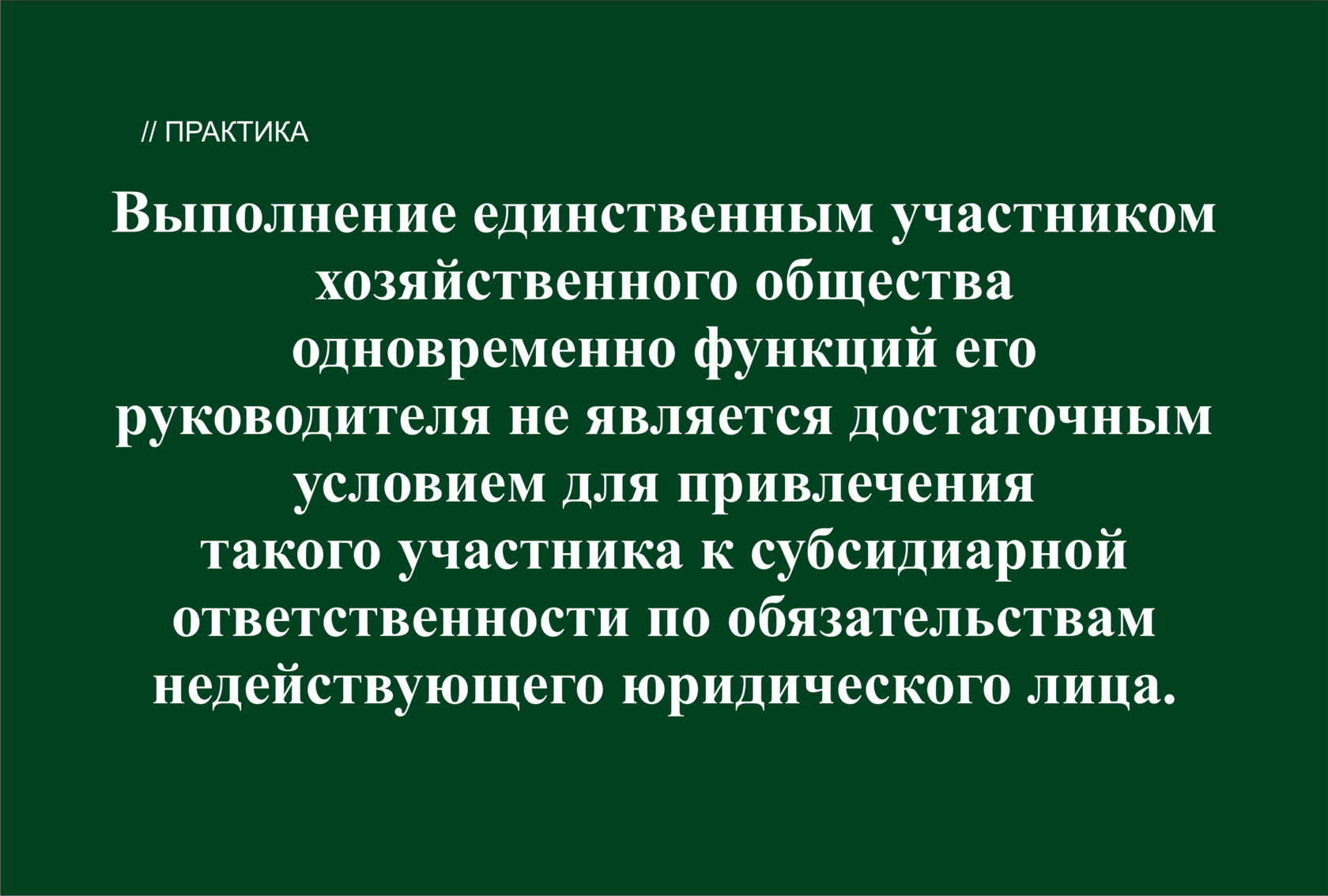 В ситуации, когда единственный участник хозяйственного общества одновременно выполняет функции руководителя, действительно присутствует риск того, что такой участник, ведущий дела общества во всей полноте, включая руководство его текущей деятельностью (участвующий в переговорах с контрагентами, заключающий сделки от имени общества, свободно распоряжающийся имуществом общества и т. п.), будет использовать правовую форму юридического лица только в качестве средства защиты от имущественных притязаний кредиторов по отношению к себе лично.